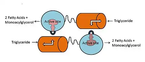 Мономеры ЛПЛ в димерном состоянии фермента находятся в перевёрнутом по отношению друг к другу положении. Триада серин-аспарагин-гистидин расположена в гидрофобном углублении, которое закрыто от внешней среды покрывающим фрагментом[1][11]. При связывании апоС-II и липопротеинового липида с C-доменом представляет молекулу липида покрывающему фрагменту и гидрофобному углублению, что приводит к транслокации покрывающего фрагмента и открытию активного центра фермента. β5-петля уходит в центр белка и приближает электрофил оксианионной дыры в положение для липолиза[1]. При этом глицеридная часть молекулы триглицерида входит в активный центр и эфирная связь гидролизуется.