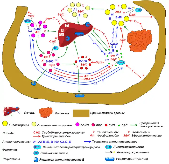 Специфичности рецепторов апопротеинов Е и В-100 частично пересекаются. Они находятся на поверхности мембран клеток в клатриновой кавеоле. При соединении с лигандами кавеола замыкается в везикулу и липопротеин эндоцитируется. В лизосомах эфиры холестерина гидролизуются и холестерин поступает в клетку.