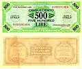 В 1943 году Союзное военное правительство начало выпуск печатавшихся в США денежных знаков. Был установлен курс: 1 доллар США = 100 лир, 1 фунт стерлингов = 400 лир.