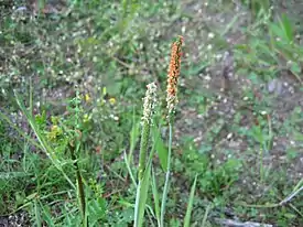 Общие соцветия — густые, узкоцилиндрические, колосовидные метелки (1,5) 2—5 (8) см длиной, 3—5 мм шириной. Колоски одноцветковые, эллиптические, (1,7) 2—2.6 (3) мм длиной, собраны по 2—11, располагаются на коротких, прижатых к главной оси, веточках. Колосковые чешуи сросшиеся только у основания, сплюснутые с боков, ланцетовидные, 2—2,5 мм длиной, килеватые, по килю и по краям реснитчатые, с 2 зелеными, коротко-прижатоволосистыми жилками, на верхушке тупые или округлые, верхушки параллельные или почти сходящиеся, по краям широкопленчатые. Нижние цветковые чешуи широколанцетные, голые, туповатые, 2—2,2 мм длиной, с прямой остью, выходящей из середины спинки. Молодые пыльники светложелтые, старые темнооранжевые, округлые или округло-овальные, (0,4) 0,5—0,8 (1) мм длиной. Зерновки 0,8—1 мм длиной.