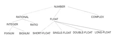 На иллюстрации справа показан фрагмент этой иерархии: надтипом для значений числовых типов является NUMBER, его подтипы — RATIONAL, FLOAT и COMPLEX, — представляют, соответственно, рациональное число, число с плавающей запятой и комплексное число, первый из которых, в свою очередь, имеет подтипы INTEGER (целое число) и RATIO (рациональная дробь), второй — несколько подтипов, представляющих числа с плавающей запятой с разной степенью точности, и так далее.