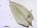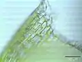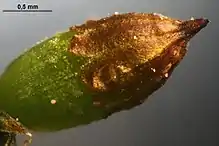 Основанием называется место прикрепления листа к стеблю. Противоположный конец называют верхушкой. Листовые крылья или листовые ушки развиваются на углах основания листа. Ушки резко отличаются формой, окраской и размерами от остальных клеток и служат для сохранения воды. Кайму листа образуют длинные и узкие клетки, расположенные в один или несколько рядов по краю листа.