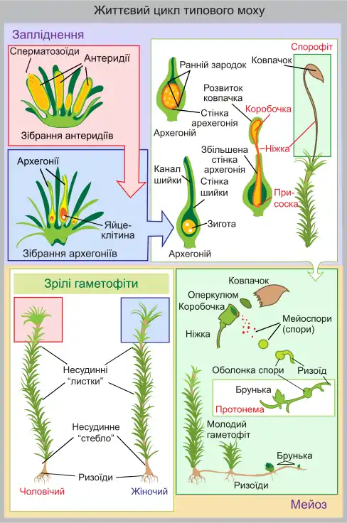 В результате оплодотворения яйцеклетки в брюшке архегония образуется зигота. Нижняя клетка в процессе деления образует нижнюю часть ножки и стопу, прорастающую сквозь стенку брюшка архегония до тканей гаметофита. Из верхней (апикальной) клетки поделившейся зиготы формируется коробочка.