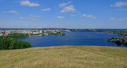Вид с вершины горы на город и пруд