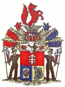 Щит увенчан дворянскими шлемом и короною, на поверхности которой означена выходящая лисица. Намёт на щите красный и голубой, подложенный золотом. Щит держат два матроса, имеющие в руках вымпела.