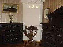 Ещё живя в Михайловском, Григорий и Варвара Пушкины заказали у виленских мастеров мебель для усадьбы. Большая её часть изготовлена из дуба из окрестностей Вильны. Мебель украшена гербом рода Пушкиных и инициалами Варвары Пушкиной. Она экспонируется в мемориальной экспозиции музея, развёрнутой в шести комнатах первого этажа, знакомящей с бытом виленских помещиков конца XIX — начала XX веков. Среди экспонатов в гостиной — рояль фирмы «Беккер», изготовленный в 1876 году, портрет дяди Варвары Пушкиной министра путей сообщения П. П. Мельникова, круглая голландская печка, облицованная зелёными изразцами. В «пушкинском уголке» хранятся ломберный столик и два кресла с обивкой зелёного бархата, принадлежавшие А. С. Пушкину и привезённые из Михайловского Григорием и Варварой Пушкиными. Стены этой комнаты обиты копией (созданной вильнюсскими текстильщиками по сохранившимся образцам) полотна, вышитого крепостными в Михайловском. В столовой сохранились подлинный мозаичный паркет, резные стулья работы варшавских мастеров (XIX век) с гербами городов Италии на спинках, четыре дубовых буфета, обильно украшенных резным растительным орнаментом. В соседней бильярдной комнате разместился большой бильярдный стол. В экспозиции представлены семейные фотографии, а также картины и аппликации В. А. Пушкиной.[9] В шкафу красного дерева хранится 21 прижизненное издание произведений А. С. Пушкина (при жизни поэта было выпущено 34 книги).[10] В трёх комнатах, бывших прежде спальнями, размещается обзорная экспозиция, посвящённая жизни и творчеству А. С. Пушкина [11].