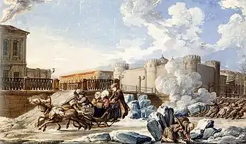 В «Национальных изображениях Промышленников, снятых с натуры в Санкт-Петербурге», изданных в 1799 г. Я. И. Басиным, находим любопытное изображение старовского замка, снабжённого соответствующим комментарием: «Прямо их за каналом бастилия или новый едикуль, обнесённый высокою каменною стеною, на которой находится пять круглых башен».[38]