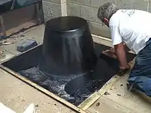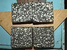- Широкое применение в Германии получили покрытия в жилых и производственных помещениях, в том числе, в медицинских учреждениях. Подобные покрытия, приготовленные на основе хрупких битумов, обладают высокой прочностью при изгибе, низкой теплопроводностью, экологичностью и отсутствием запаха и пылеобразования. Литые асфальтобетоны, уложенные толщиной слоя от 20 до 35 мм, применяются в сочетании с плотными тепло- и звукоизоляционными материалами на бетонных и деревянных перекрытиях[21]. Поверх таких покрытий укладывают линолеум, ковролин или керамическую плитку. Литой асфальтобетон для покрытия полов в Германии подлежит техническому нормированию[22].