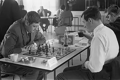 Зональный турнир (Гаага, 1966 г.). М. Литтлтон играет белыми с И. Доннером (партия завершилась победой Доннера на 22-м ходу).