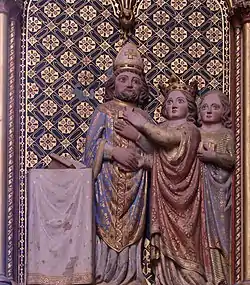 ![]() Епископ Лиутвард, императрица Рихарда и служанка. Деталь рельефа из церкви Святых Петра и Павла в аббатстве Андлау (XIV век) | ||