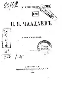 ![]() Титульный лист книги «П.Я.Чаадаев. Жизнь и мышление» М. О. Гершензон (1908) | |