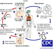 У жителей эндемических очагов и у приезжих проявления болезни отличаются. У некоторой части коренного населения она протекает бессимптомно, с микрофиляриемией. В данной ситуации диагноз устанавливается лишь после миграции взрослого паразита под конъюнктиву. У остальной части периодически появляется калабарская опухоль — ограниченный отёк Квинке с эритемой, локализующейся на конечностях, а также других участках тела. Могут возникать нефропатия, энцефалопатия, а также дилатационная кардиомиопатия. У приезжих чаще преобладают симптомы аллергии: калабарская опухоль возникает чаще и течение её тяжелее. Микрофиляриемия редка. Лабораторные признаки: эозинофилия, высокий титр антител к филяриям. Причиной калабарской опухоли считают аллергию на взрослых паразитов. При локализации паразитов в глазах может возникать конъюнктивит.