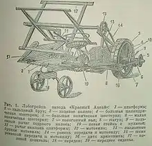 Лобогрейка состоит из рамы платформы и рамы ходового колеса, жёстко соединённых между собой и опирающихся на ходовое и полевое колёса. Передняя часть рамы ходового колеса шарнирно соединена (см. шарнир) со ступицей 2-колёсного поворотного передка.