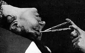 Широкое распространение получил разработанный в 1945 году американцем Уолтером Фрименом метод трансорбитальной лейкотомии («лоботомия топориком для льда»)[8], при котором не требовалось сверлить череп пациента. Фримен стал ведущим пропагандистом лоботомии. Свою первую лоботомию он провёл, используя в качестве обезболивания электросудорожную терапию. Он нацеливал зауженный конец хирургического инструмента, напоминающего по форме нож для колки льда, на кость глазной впадины, с помощью хирургического молотка пробивал тонкий слой кости и вводил инструмент в мозг. После этого движением рукоятки ножа рассекались волокна лобных долей головного мозга. Фримен утверждал, что процедура устранит из «душевной болезни» пациента эмоциональную составляющую. Первые операции проводились с помощью настоящего ножа для колки льда[9]. Впоследствии Фримен разработал для этой цели специальные инструменты — лейкотом, затем — орбитокласт. Фактически вся операция проводилась вслепую, и в результате хирург разрушал не только поражённые, по его мнению, участки мозга, но и значительную часть близлежащей мозговой ткани[7].