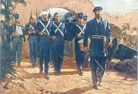 ![]() Генерал Джон Китман и батальон морских пехотинцев, прибывшие в Мехико в 1847 году. Картина Тома Ловелла | |