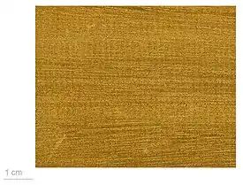 Бревно имеет диаметр от 60 до 120 сантиметров, толщина заболони — 3-7 сантиметров (явно выражена), текстурированность мелкая. Цвет древесины коричневый, желто-коричневый или серо-коричневый с черными полосками или венами с золотистым отблеском, с черными отложениями в порах.