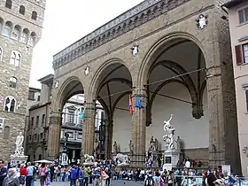 Выдающимся памятником архитектуры раннего итальянского Возрождения является Оспедале дельи Инноченти (Воспитательный дом) во Флоренции с «аркадой по колоннам» главного фасада (1419—1445). В ренессансной Флоренции знаменита Лоджия деи Ланци (1376—1382), построенная на углу площади Синьории (главной площади города). Её настоящее название: Лоджия делла Синьория (итал. Loggia della Signoria) — сооружение на площади Синьории, которое предназначалось для собраний членов Флорентийской Синьории (выборных лиц для управления городом). Позднее лоджию приспособили для размещения городской гвардии, вооружённой алебардами (итал. lancia — копьё, пика), что дало повод к новому названию. Похожую архитектуру имеет во Флоренции Меркато Нуово (Новый рынок; 1547—1551).
