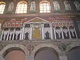 Мозаика главного нефа базилики Сант-Аполлинаре-Нуово в Равенне, Италия. Изображает аркаду Дворца Теодориха. Вместо уничтоженных в VI веке образов арианских святых в опустевших арках изображены драпировки