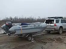 Маломерное судно спущено на воду, лодочный прицеп частично в воде
