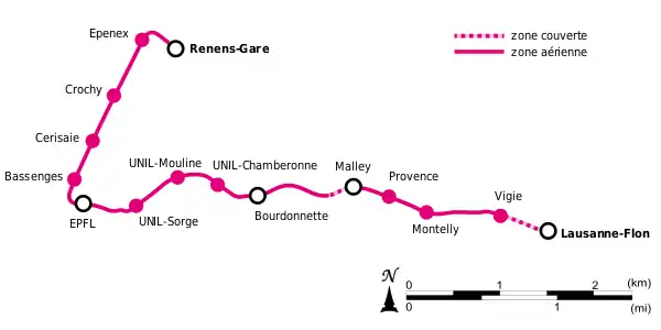 На линии имеется пятнадцать станций. В Лозанне конечная станция метро совмещена с конечной станцией пригородной узкоколейной железной дороги LEB (станция подземная, двухуровневая. Метро и LEB используют разные уровни). В Ренане конечная станция метро совмещена со станцией государственных железных дорог.