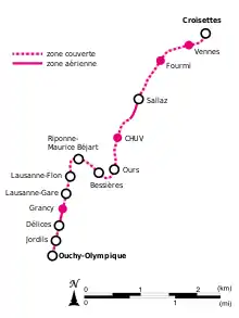 - От станции Lausanne-Flon до станции Vigie (сразу за Vigie линия выходит из тоннеля)
