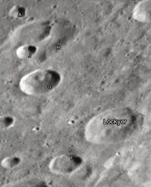 - Сателлитный кратер Локьер G имеет центральный пик необычной сферической формы.