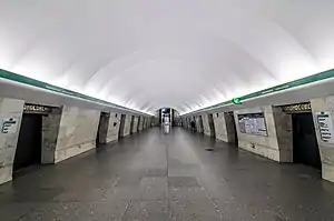 В оформлении перронного зала доминируют нежный, «фарфоровый» колорит и смягчённые архитектурные формы, своеобразие наклона стен внутрь зала. Станционные двери простые, без рисунка. Над каждой дверной нишей латунная надпись «Ломоносовская». Торцевую стену из белого мрамора украшает бронзовый барельеф, посвященный М. В. Ломоносову (художник В. М. Городецкий).