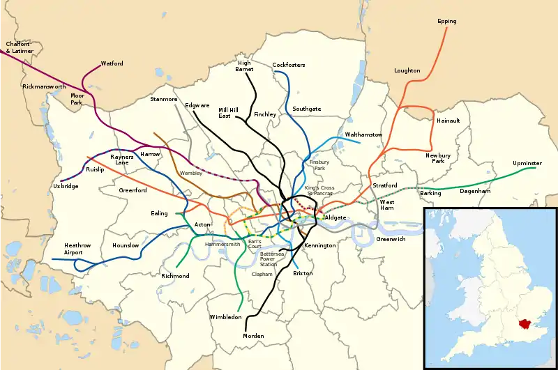 Ло́ндонский метрополите́н (англ. London Underground) — система линий метрополитена в Лондоне (Великобритания). Лондонский метрополитен — один из крупнейших в мире, его сеть состоит из 11 линий общей протяжённостью 402 км, из которых 45 % проходит под землёй[2]. По суммарной длине линий метрополитен занимает пятое место в мире после сеульского, пекинского[3], шанхайского[4] и московского. Лондонское метро насчитывает 270 станций.