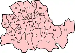 Боро Лондонского графства, номера совпадают с рисунком справа:
