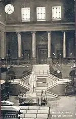 Инфраструктура станции была значительно расширена с открытием 27 мая 1849 года Большого зала. Он был спроектирован Филипом Чарльзом Хардвиком, сыном автора исходного проекта вокзала, в классическом стиле с кессонным потолком и широкими двойными лестницами, ведущими в административную часть на северном конце. Зал имел 38 м в длину, 19 м в ширину и высоту потолка 19 м[28]. Скульптор Джон Томас создал для украшения зала восемь аллегорических статуй, представляющих города, обслуживаемые линией[29]. Станция располагалась на Драммонд-стрит, дальше от Юстон-роуд, чем современный комплекс. Драммонд-стрит сейчас упирается в вокзал, а ранее проходила перед его фасадом. От Юстон-сквер в сторону арки вела короткая улица под названием Юстон-гроув[30].