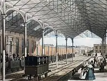 Юстон был первым междугородним железнодорожным вокзалом Лондона. Он открылся 20 июля 1837 года как конечная остановка железной дороги Лондон — Бирмингем (L&BR)[12]. Старое здание вокзала было снесено в 1960-х годах и заменено нынешним зданием в интернациональном стиле[13].