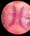 Окрашенный препарат лобкового симфиза при световой микроскопии