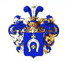 Щит увенчан дворянским коронованным шлемом. Нашлемник: три страусовых пера, из коих среднее — серебряное, а крайние — лазоревые. Намёт: справа лазоревый с серебром, слева — лазоревый с золотом.