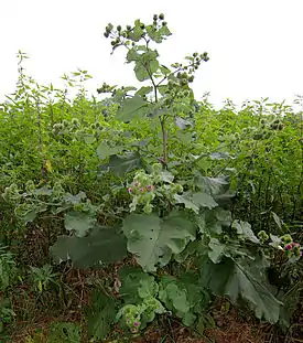 ![]() Лопух большой — типовой вид рода Лопух. Общий вид цветущего растения. Германия | ||||||||||||||