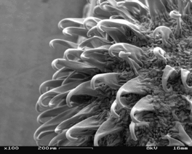 Слева направо: корзинка крупным планом; «крючки» под сканирующим электронным микроскопом (×100); семена | ||||||||||