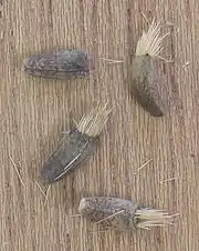 Плоды — продолговатые семянки, сплюснутые с боков, усечённые на верхушке, ребристые, между рёбрами обычно более-менее морщинистые (в особенности при основании и у верхушки), реже гладкие или почти гладкие. Хохолок короткий, щетинки его неодинаковые, шероховатые, многорядные, до основания свободные, опадающие, площадка прикрепления базальная, прямая[2]. После созревания корзинки с семенами легко цепляются к шерсти животных (или одежде человека). Таким образом семена разносятся на значительные расстояния.