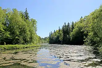 - Лопухинское радоновое озеро (гидрогеологический памятник природы) Является памятником природы гидрогеологического типа местного значения. В верховьях долины родников построены две плотины, выше которых образовались два небольших искусственных озера (расстояние между ними — около 50 м, длина верхнего озера примерно 200 м, нижнего 550 м, ширина озёр 40-60 м) с водой бирюзово-изумрудного цвета, питающееся родниками, вытекающими из трещиноватых ордовикских известняков. Подземные воды, питающие родники залегают на глубине 10-15 м от поверхности. Их выходы в виде родников и ключей формируют исток реки Лопухинка. Эта вода традиционно считалась лечебной. Обогащение радоном трещинных вод известняков происходит за счёт радиоактивных диктионемовых сланцев, обладающих повышенным содержанием урана. Произведённые эманационным методом определения радона в воде источника дали концентрацию в 54 Бк/л. Площадь памятника природы — 16,0 км².