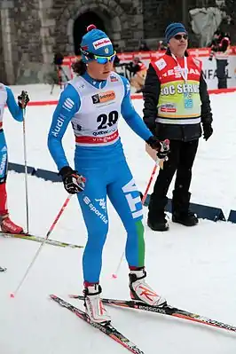 Использует лыжи и ботинки производства фирмы Rossignol.