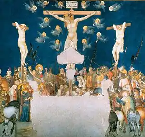 Самой большой фреской в этом цикле является «Распятие». По широте повествовательного размаха она превосходит все остальные сцены и все предшествовавшие изображения данной тематики. В ней нет обязательной фронтальности — часть персонажей обращена к зрителю спиной. Всадники на всякий случай окружают собравшихся вокруг креста людей, среди которых обессилевшая Мария. Пестрая толпа теснится вокруг креста, в небесах над ней парят ангелы.