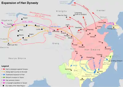 Лоуланьцы, устав от дипломатической активности Китая в регионе, ввиду возросших расходов на содержание посольств, ограбили посла Ван Хуэя (кит. 王恢). Также они вступили в союз с хунну и помогали им ловить китайских послов. В 108 году до н. э. Хань У-ди отправил хоу Чжао Пону (кит. 趙破奴) с войском из отборной пехоты и союзной конницы против Лоулани. Проводником был Ван Хуэй. С 700 лёгкими всадниками Пону захватил князя Лоулани. Лоулань была захвачена, Давань и усуни устрашены. Хунну не замедлили атаковать оазис и князь Лоулани был вынужден отправить одного сына заложником в хунну, другого в Китай. При походе китайцев на Давань в 105—104 гг. до н. э. во главе с Ли Гуанли эршинским, Император заподозрил лоуланьцев в связях с хунну. Лоуланьского князя доставили Императору, но тот оправдался сославшись на слабость княжества по сравнению с великими державами и попросил принять его в подданство. Хунну перестали доверять Шаньшани. В 92 году до н. э. старый князь умер и старейшины приехали к Императору просить вернуть наследника. Но У-ди вероломно кастрировал его и отправил работать в шелкопрядную, а старейшинам ответил, что заложника не отпустит, а они пусть выберут князем следующего брата. От нового князя также потребовали сына в заложники. Хунну поступили также. Новый князь вскоре умер и хунну стали продвигать своего заложника Чангуя (кит. 嘗歸) на трон. Хань Чжоу-ди пытался вызвать его в Чанань, но мачеха настояла, чтобы князь не поддавался на уговоры китайцев. Чжоу-ди решил, что Лоулань предалось хунну.