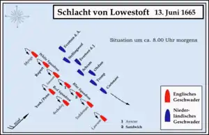 Обдам ещё больше спутал свою линию тем, что, следуя примеру герцога Йоркского, вышел вперёд, чтобы стать головным. Англичане спускаются для уменьшения боевой дистанции, голландцы делают то же, так что оба флота идут рядом в бакштаг под малыми парусами. Произошло небольшое замешательство, когда английский главнокомандующий увидел, что идущий впереди флагманский корабль Лоусона сначала спустился под ветер, а потом снова поднялся. Густой пороховой дым мешал определить причину; чтобы в любом случае сохранить наветренное положение, герцог Йоркский приводит к ветру, вместе с ним приводит его эскадра, и удаляется несколько от неприятеля. Когда пришло известие, что Лоусон тяжело ранен, англичане снова повернули на противника.