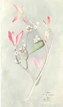 Пирамидальное метёлкообразное соцветие имеет длину от 15 до 20 см. Черешки цветов от 1 до 1,5 см длиной и гладкие. Белые обоеполые цветы имеют пять лепестков и радиально симметричны. Пять гладких чашелистников не одинаковы: два внешних яйцеобразны и заострены, имеют длину 7-8 мм и ширину 4-5 мм; три внутренних овальные, 6 мм длиной и 5 мм шириной. Гладкие лепестки сердцеобразны, длиной 1,7 см и 1,3 см шириной. 4-5 миллиметровые мужские цветки несут тычинки от 4 до 6 мм длиной и оранжевые пыльцевые мешки. Завязь белая, длиной 8 мм и шириной 3, имеет от 8 до 16 семяпочек. Рыльца длиной от 1 до 2 мм.
