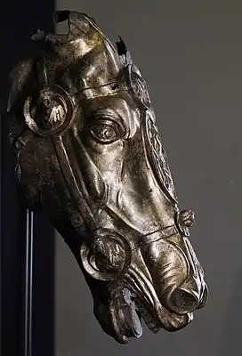 Голова лошади, являющаяся фрагментом неизвестной скульптуры, находилась на глубине 11 метров под землей в обрушившейся шахте колодца спрятанной в деревянной бочке и была обнаружена в ходе археологических раскопок бывшего на этом месте римского поселения.