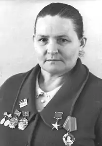 Указом Президиума Верховного Совета СССР от 8 апреля 1971 года «за выдающиеся успехи, достигнутые в развитии сельскохозяйственного производства и выполнении пятилетнего плана продажи государству продуктов земледелия и животноводства» удостоена звания Героя Социалистического Труда с вручением ордена Ленина и золотой медали «Серп и Молот»[2][4].
