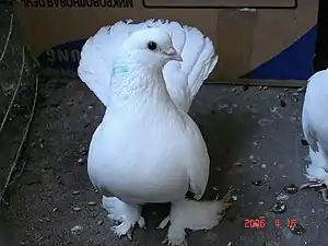 Голова округлой формы, без чуба, гладкая. Шея средней длины и толщины, при возбуждении голубь сильно ей трясёт. Переход от лба в шею составляет дугу без изломов. Глаза темного цвета, среднего размера. Веки белого цвета, узкие. Клюв белого цвета, прямой, средней длины, хорошо сомкнут. Восковица белого цвета, продолговатая, похожа на припудренную. Грудь высоко приподнята, широкая и выпуклая. Спина короткая, немного выпуклая. Крылья длинные, неплотно прижаты к корпусу. Концы крыльев не касаются пола, хотя опущены ниже хвоста. Хвост состоит из 16-20 перьев, широкий, поднят высоко — на 45-70°. Ноги короткие и сильно оперены, длина косм 5-6 сантиметров. Когти белого цвета. Оперение белого цвета, хорошо прилегает к телу, широкое и плотное.