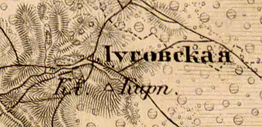 ЛУГОВСКОЕ — деревня принадлежит её величеству, число жителей по ревизии: 98 м. п., 108 ж. п.[4] (1838 год)