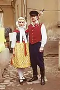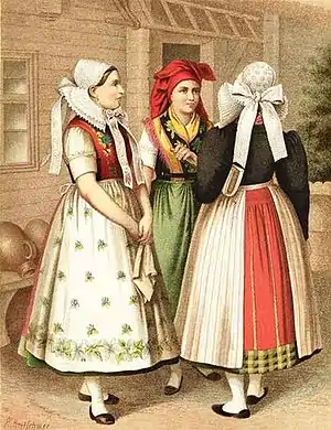 Серболужицкая народная одежда имеет общие черты с одеждой других западных славян, особенно с поляками (ношение женщинами передника, обилие украшений на праздничных костюмах — вышивок, кружев, лент). Самобытная одежда сохранилась в основном у женщин. Лужицкий этнограф П. Недо различал четыре комплекса женской одежды в Лужице: шпревальдский, шлейфенский, гойерсвердский и бауцен-каменцкий. Последний комплекс распространён в районах Баутцена, Каменца и Виттихенау. Праздничная одежда бауцен-каменцкого комплекса включает белую рубашку из полотна с короткими рукавами и круглым вырезом, верхнюю шерстяную юбку чёрного цвета и нижнюю шерстяную юбку. Верхняя юбка пришивается к корсажу, который шнуруется или застёгивается. Головной убор бауцен-каменцкого комплекса состоит из чепчика чёрного цвета, с которого свисают до колен две чёрных ленты. Головной убор, распространённый в Шпревальде, отличается наличием широких крыльев. Траурные одеяния чёрного цвета сочетаются с белым головным убором[76].