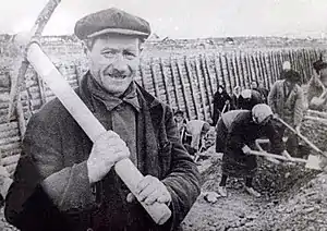 Каждый день все новые коллективы и отряды из разных организаций города и области приступали к работе на растянувшихся рубежах фронта. Люди ехали поездами и на машинах, шли большими колоннами. Чаще всего в этом людском потоке мелькали лица весёлых неунывающих парней и девушек… вернулись в город совсем не так скоро, как думали. К тому же не на машинах, а пешком. И вернулись далеко не все. В пути оставляли иногда могилки подруг, погибших от бомбежек и пулемётного огня с самолётов…[36]Б. В. Бычевский