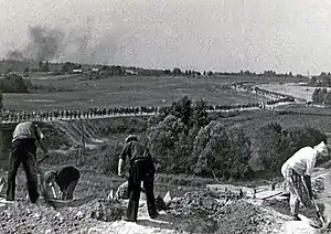 Сложилась такая практика, когда сооружение первой линии обороны осуществляли военнослужащие, а вторую и последующие строили мобилизованные рабочие, служащие, студенты и школьники старших классов. К середине июля уже свыше 200 тысяч человек рыли траншеи, ходы сообщения, стрелковые и пулемётные окопы, противотанковые рвы, строили ДОТы, ДЗОТы, командные, наблюдательные и санитарные пункты, устраивали лесные завалы и противотанковые надолбы[37].