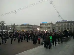 9 сентября 2001 года в стране состоялись президентские выборы. Во время кампании Лукашенко обещал поднять стандарты сельского хозяйства, размер социальных пособий и увеличить объём промышленного производства Белоруссии[61]. Лукашенко победил в первом туре, набрав 75,65 % голосов. ОБСЕ заявил, что процесс «не соответствовал международным стандартам»[61][62]. Россия, в отличие от ОБСЕ, публично приветствовала переизбрание Лукашенко. Президент России В. Путин позвонил Лукашенко, поздравил с победой и выразил желание сотрудничать[61]. До и после выборов в стране проходили акции протеста, организованные В. Левоневским.